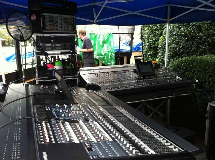 My personal involvement with the site began on the morning of the fourth day before my event. There would be one event two days before mine, an evening concert with a band and a dance troupe. Because we’d be sharing the stage and all facilities, it was decided to pool the crews to make the task go quicker. Early on a foggy morning the consoles were delivered to front-of-house world.