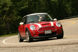 In the MINI Cooper S, we worked between second and third gear, surfing the middle of the of the car's power band. We spent our time alternately pulling upgrade and engine-braking downgrade while managing the curves. With the positive inboard banking, our motion gave the impression of a roller coaster ride. The MINI performed marvelously, hugging the road, being splendidly predictable, giving plenty of feedback, and punctuating the occasional turn with a chirp. I suppose that is totally understandable because this is exactly the kind of driving the car was designed for. The deep turns such as “The Whip” and “Crud Corner” provided plenty of excitement, but the combo turns were the biggest challenge, with a second turn waiting just as you eased out of the first. We found the emergency vehicles and wreck about two miles into the course. A cyclist had overshot a curve and lost his bike down a near-vertical, forty-foot hill. No time to gawk – just avoid and continue to drive. On one run, Ruth attempted to follow a route map and the odometer and call the curve names as we approached them, but she gave up about halfway through the course due to the difficulty and discomfort of reading a map while the car was whipping around corners.