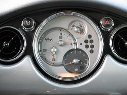 05/17/06 My Cooper S is back at the dealership having the last of the tweaks from my last visit tied up. While it is there they are letting me use a loaner MINI, this time a late-model Cooper in British Racing Green with a black roof. Loaners are great! Thanks, Checkered Flag! It also gives me a chance to see cars with features other than my own. This car features the interior OEM chrome pack. Very nice! This is the first time I've driven a car with the Chrono pack. I'm not too keen on it, really. I could grow to love the dual cluster on the column, but the collection of meters in the Chrono is a bit strange to my eye. I'm sure it is a personal taste thing. I love the gentler ride of the standard Cooper for everyday driving but I miss the handling and pickup of my S. Oh well, it's only a couple of days. Last weekend it came to my attention that the chrome trim around the grille of the new MINIs isn't ribbbed, like the 2003 used to be.