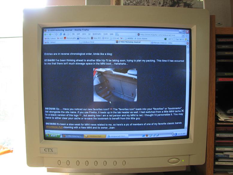 03/30/06 The Weather today: Patchy fog, low of 43, high of 62. This morning, I had to switch cars in order to drive the MINI out of the driveway. The cold-weather routine goes something like this: Unlock MINI and start her up. Turn on defrost and heated seats. Split keychain. Go move the van into the street, leaving it running. Back out the MINI, leaving it in the street. Park the van back in the driveway. Get in the MINI. By now, I'm getting pretty chilled but the heated seats are warming up, so that's really cool. By the time I get to the MINI the second time, the back window and side view mirrors are clear.