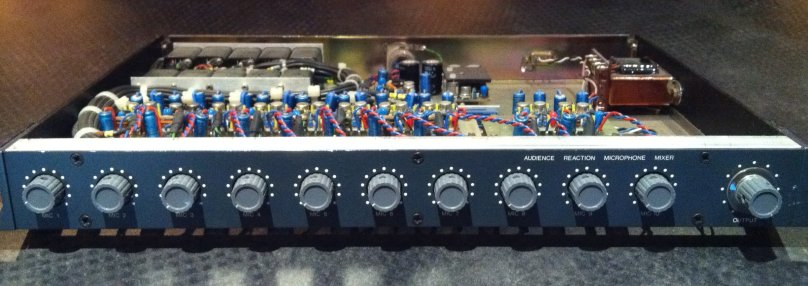 Ok, so it isn't a console. You are looking at a Neve Audience Reaction Microphone Mixer, a small, one rack space 10x1 outboard mixer offered as an option to expand the capabilities of 1970s Neve consoles when they were used in broadcast applications. This one was ordered with the 8024 console I'm pictured working at below during a session. The Reaction Mixer was a basic little guy, but designed and built to the highest standards by the master (Ruper Neve) with top flight components including ten input pots with concentric push/push on/off switches and lovely isolating transformers. It's a wonderful little piece of recording history and of my history as well. The pic below is from 1984 when I was a wee lad of twenty-seven, by the way: