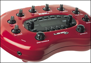 PHYSICAL: The POD is cleverly packaged in a bright red, rounded, aluminum box with an assortment of knobs, buttons, and rotary switches, and a small readout on the front. The cool art nouveau kidney-bean shape is practically irresistible. It reminds me of the opthamologist's apparatus, or maybe those coin-op binoculars at tourist attractions. The front-panel knobs and switches have a neat retro look to them. The outputs are balanced tip-ring-sleeve plugs with enough juice to feed anything from a high-end recording console (+18dbv or 30v peak to peak) to a guitar amplifier (-60dbv or 1v peak to peak). POD "senses" whether one or two plugs are inserted in the outputs and serves up its sounds mono or stereo accordingly. The inputs, outputs, MIDI and footpedal jacks, and some switches, are arranged around the perimeter of the bean logically. There are inlets for a mounting bracket on the back. The POD can be used live with the optional Line6 floorboard or four-switch footswitch (see below).