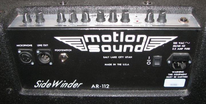 I LOVE swirly, three-D guitar sounds. I really do. I just love to hear the guitar swirl around a room. I originally fell in love with the swirly sound of the Leslie Rotating Speaker* in the late '60s and early '70s with Badfinger and George Harrison's early solo career. I then moved on into the lush Leslie sounds of Joe Walsh, first in the James Gang and then solo and with the Eagles. Somewhere along the line I discovered David Gilmour and was impressed with his lovely swirly sounds as well. Recently, after experiencing Pink Floyd s PULSE DVD, I became really absorbed in the complex rotating speaker sounds David was able to achieve seamlessly on stage with his custom "Doppola" rotating speaker units. I love the way he pipes echo through a Leslie for a REALLY spacey sound. Did I mention that I love swirly, three-D guitar sounds? Whatever. Through the years I could never afford a Leslie or the space to store it, so I bought the most popular simulator pedal around, the Hughs & Kettner Rotosphere. Perhaps the degree of my Leslie mania is best established by the fact that, despite owning the Rotosphere, when I discovered a Motion Sound Sidewinder rotating speaker guitar amplifier lying used in a local guitar store, I had to try it. I just had to. This interesting combo amplifier was produced between 2001 and 2005. The model is no longer produced, having been replaced by a similar but non-powered system designed to connect to your guitar amp. As a result, a pawn shop may just be the only place you can find one of these. I watched this one languish at the local guitar store for six months, during which I eventually fell in love with it. I suppose it was inevitable that it came home with me. In keeping with my policy of pursuing the trailing edge of the cutting edge of technology, I was able to procure it for a song and a dance.