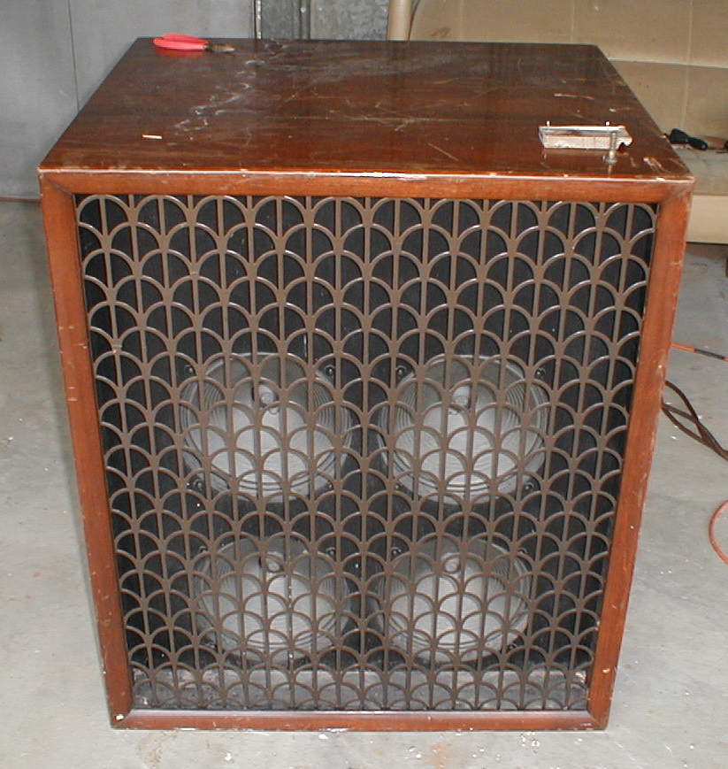 Around 1975, when my guitar gigging started to become serious, I had to work my way into equipment piece-by-piece because I didn't have the spare cash to buy it outright. When it was time for a serious electric guitar amp I could only afford the amp head proper, a Fender Bandmaster, but not a speaker system. So I saved up and bought a couple of old reconed 1960s 12" guitar speakers and asked my dad to help me build a cabinet for my amp. He scratched his head for a couple of seconds with that far-away look and said, "Ah! I know just the thing." Down in the basement we had a "Hammond Tone Cabinet," a behemoth designed to project the sound of a Hammond organ from a church's organ loft. Why did we have such a thing? I have NO IDEA. This box was two and a half feet wide, three feet deep, and just short of five feet tall and offered four twelve-inch speakers in a line. In the back there was a power amp chassis but the tubes and tube chart were long gone. It was finished in cherry veneer and sported an interesting gothic metal grille matching models from the 1930s and 1940s.