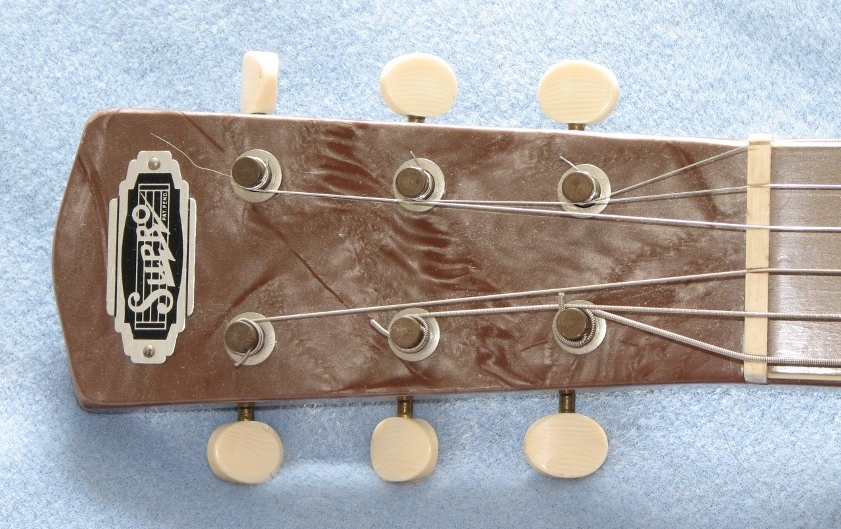 When I first plugged it in, it made a sound like it was "fretting out" if you put a bar at the twelfth fret position. That's a pretty good feat, given that the guitar has no frets. It turned out that someone had cranked up the pole pieces for extra gain, but had cranked them so far that the strings made contact with them when the guitar was played. A quick tweak right in the store with a jeweler's screwdriver sorted them out and revealed the lovely vintage sound of this little beastie. Supro developed a neat strings-through pickup system with staggered pole pieces that this guitar features.
